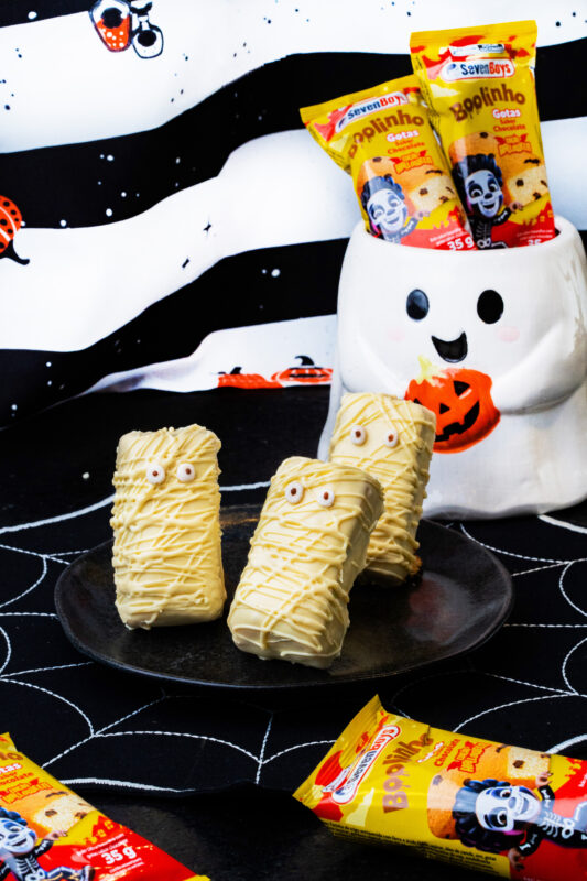 A primeira sugestão é o Boolinho de Múmia, uma opção simples e divertida para preparar com as crianças. Usando o Bolinho Gotas Sabor Chocolate como base, que tem textura leve e macia, a receita transforma um lanche comum em uma decoração temática irresistível, com poucos ingredientes e muito charme.