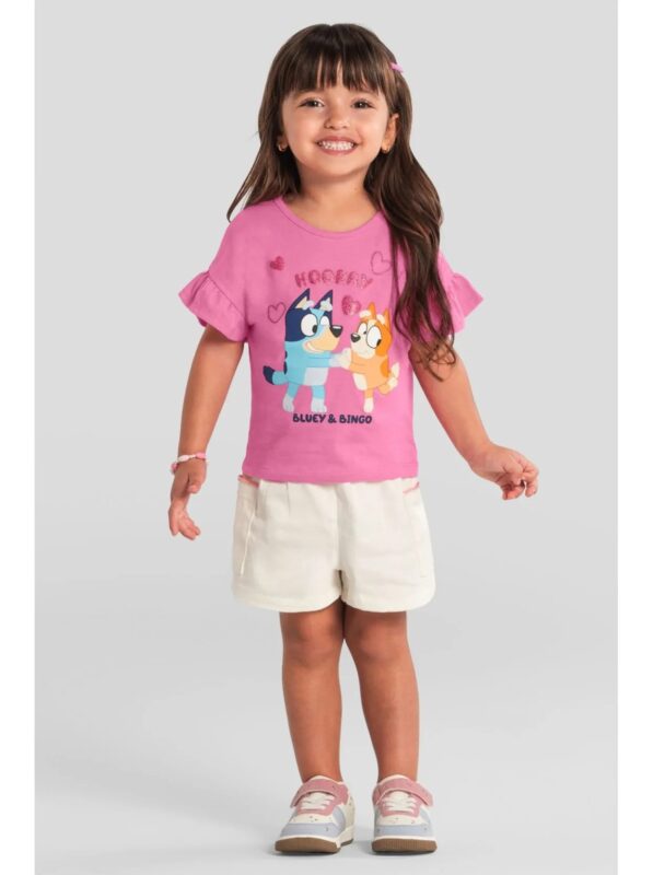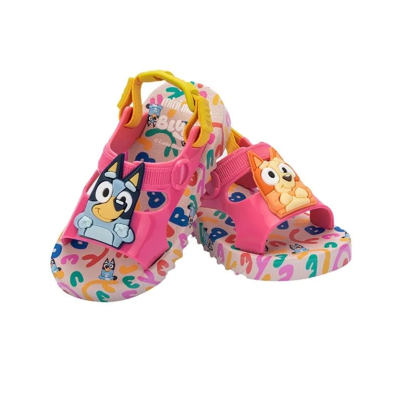Sandálias infantis com aplique em plastisol das irmãs Bluey e Bingo. Leves, estilosas e fáceis de calçar. Ideais para o verão e cheia de personalidade.