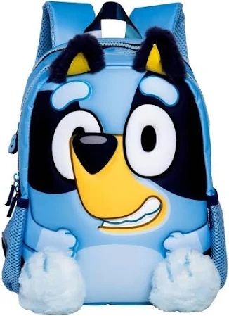 Modelo 3D com carinha da Bluey, orelhinhas e patas em pelúcia. Espaçosa, confortável e perfeita para levar brinquedos, lanches e o que mais a criança quiser.