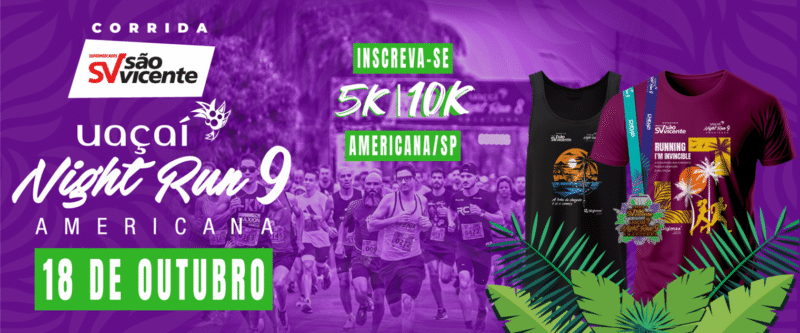 9ª Corrida São Vicente Uaçaí Night Run acontece no dia 18 de outubro com percursos de 5 km e 10 km, além de show de pagode pós-provas