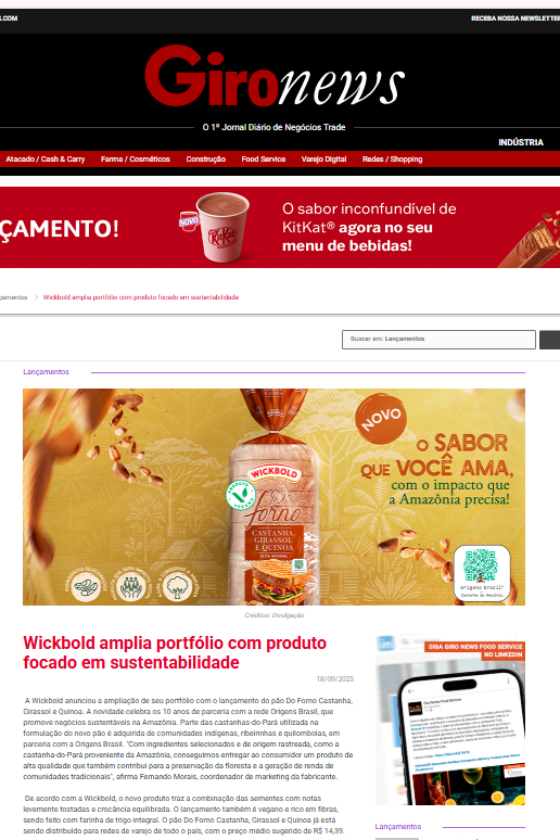Líder no segmento de pães especiais e saudáveis, a Wickbold celebra em 2025 seus 87 anos de atuação no mercado brasileiro de alimentação. Fundada em 1938 por Henrique Wickbold, imigrante de origem alemã, começou a atuar como uma pequena padaria localizada no Brooklin em São Paulo, a qual passou a administrar com o nome de Padaria Wickbold. Atualmente, a companhia conta com quatro fábricas: Diadema, onde funciona também a matriz administrativa; Hortolândia, que tem uma das maiores capacidades produtivas do Brasil; além da unidade no Rio de Janeiro e Guarapuava, no Paraná. Em constante expansão, a empresa adquiriu a Seven Boys em 2015, marca especializada em pães industrializados com mais de 70 anos de tradição que tem as famosas bisnaguinhas como carro-chefe. Além de atender de forma pioneira no país às demandas do consumidor por saudabilidade, os produtos da marca também são reconhecidos pelo sabor e alta qualidade. O portfólio atual conta com mais de 40 itens, divididos nas categorias pães de forma, pães de lanche, linha especial (integral e com grãos), linha sem glúten, bisnagas, tortilhas e bolinhos. www.wickbold.com.br