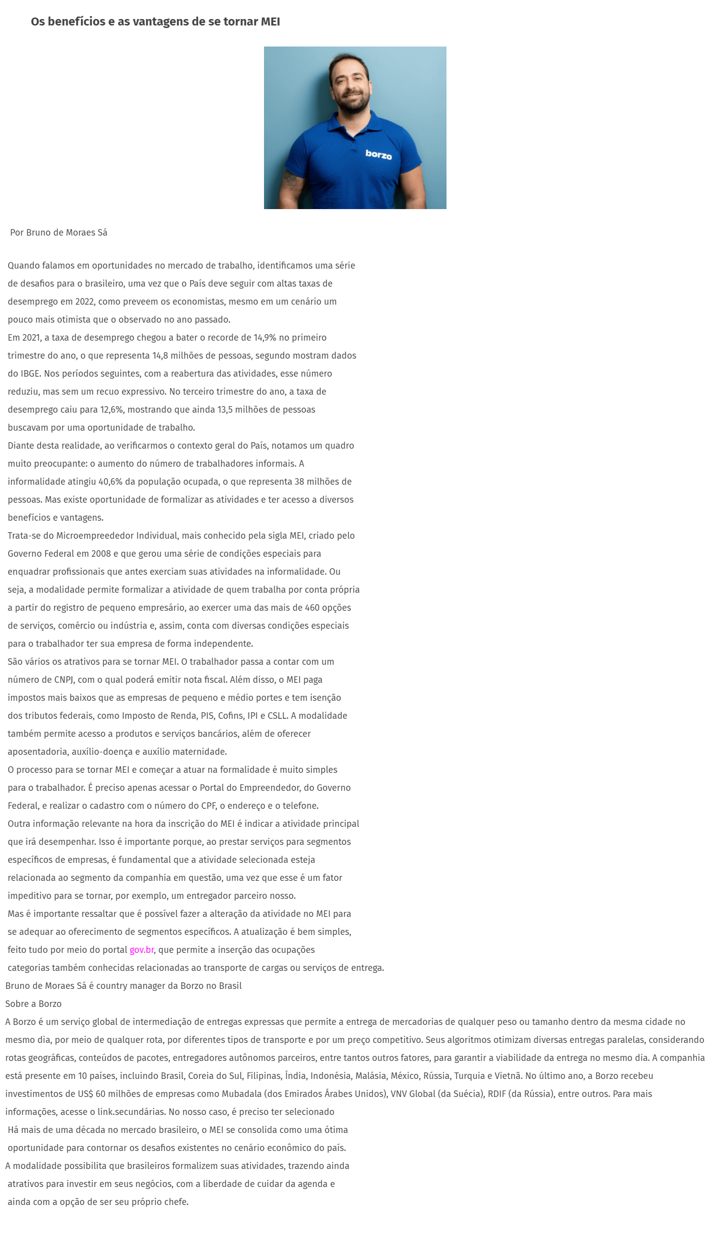 A Borzo é um serviço global de intermediação de entregas expressas que permite a entrega de mercadorias de qualquer peso ou tamanho dentro da mesma cidade no mesmo dia, por meio de qualquer rota, por diferentes tipos de transporte e por um preço competitivo. Seus algoritmos otimizam diversas entregas paralelas, considerando rotas geográficas, conteúdos de pacotes, entregadores autônomos, entre tantos outros, para garantir a viabilidade da entrega no mesmo dia. A companhia está presente em 10 países, incluindo Brasil, Coreia do Sul, Filipinas, Índia, Indonésia, Malásia, México, Rússia, Turquia e Vietnã. Seus serviços são usados por mais de 2 milhões de clientes, desde pessoas físicas a empresas, com foco principal nas PMEs. A empresa agrega 2,5 milhões de entregadores autônomos, que atendem mais de 3 milhões de pedidos por mês. Para mais informações, acesse borzodelivery.com.br