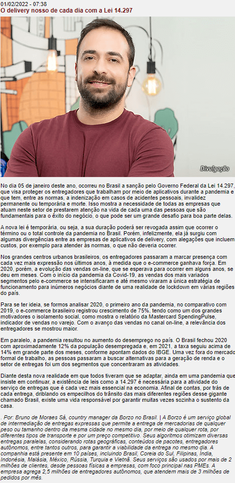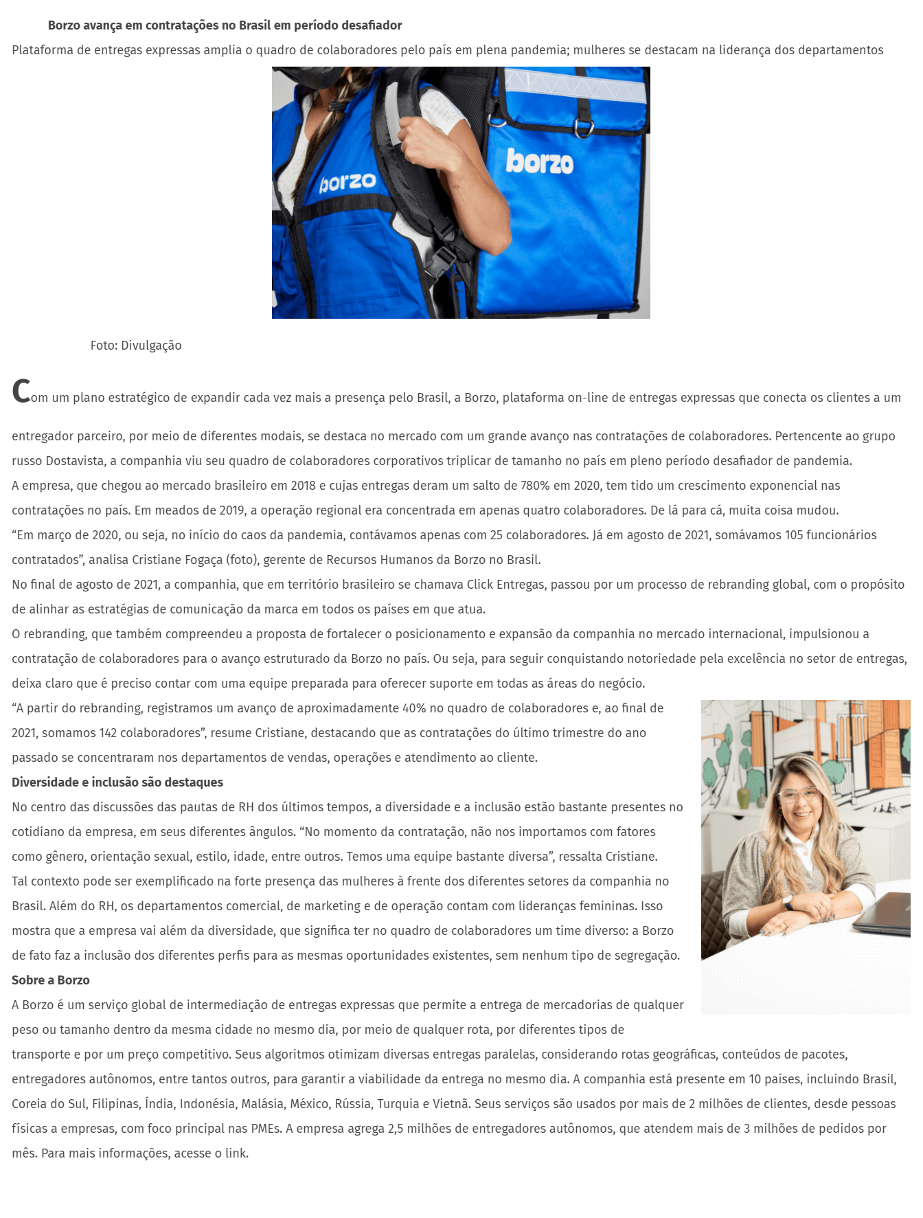 A Borzo é um serviço global de intermediação de entregas expressas que permite a entrega de mercadorias de qualquer peso ou tamanho dentro da mesma cidade no mesmo dia, por meio de qualquer rota, por diferentes tipos de transporte e por um preço competitivo. Seus algoritmos otimizam diversas entregas paralelas, considerando rotas geográficas, conteúdos de pacotes, entregadores autônomos, entre tantos outros, para garantir a viabilidade da entrega no mesmo dia. A companhia está presente em 10 países, incluindo Brasil, Coreia do Sul, Filipinas, Índia, Indonésia, Malásia, México, Rússia, Turquia e Vietnã. Seus serviços são usados por mais de 2 milhões de clientes, desde pessoas físicas a empresas, com foco principal nas PMEs. A empresa agrega 2,5 milhões de entregadores autônomos, que atendem mais de 3 milhões de pedidos por mês. Para mais informações, acesse borzodelivery.com.br
