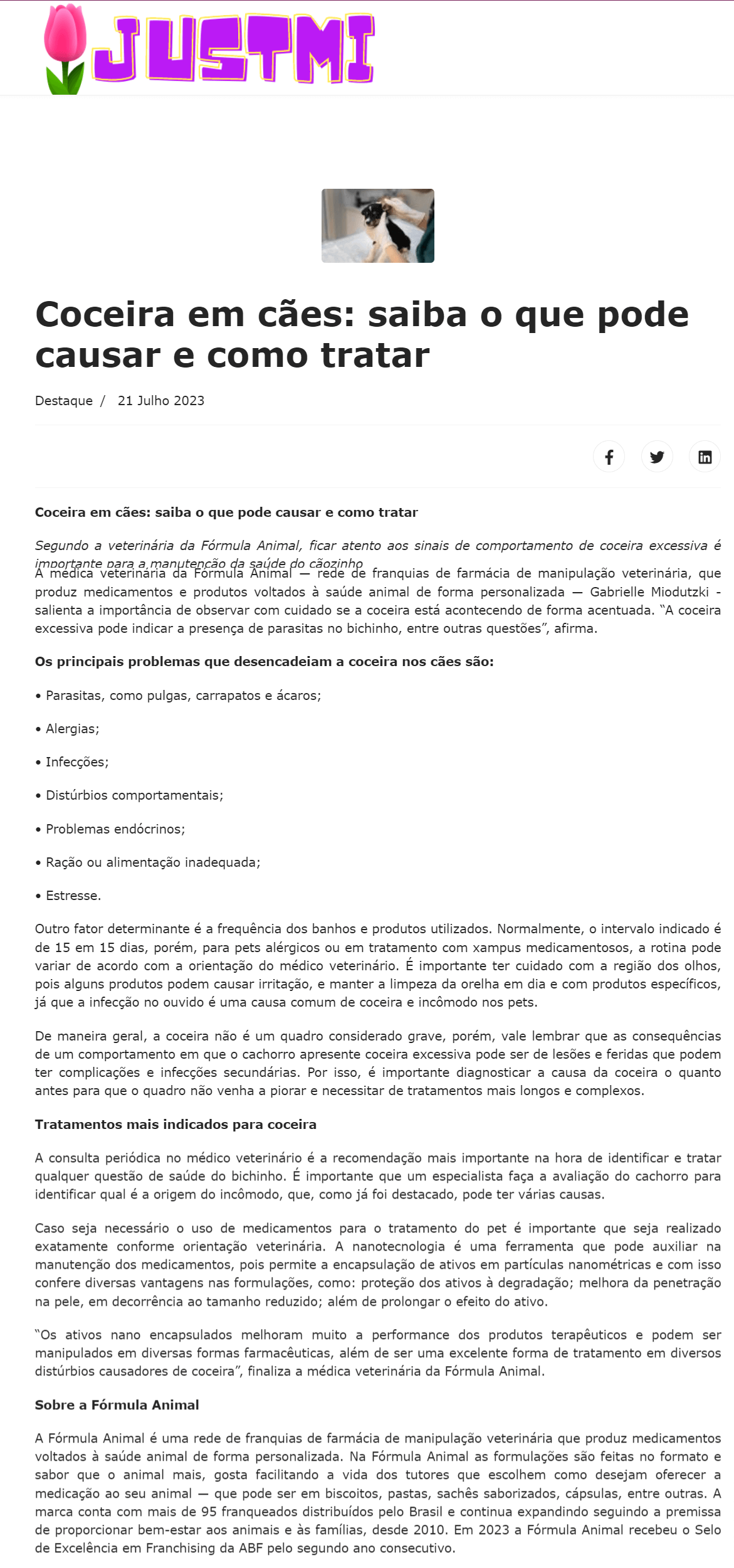 Sobre a Fórmula AnimalA Fórmula Animal é uma rede de franquias de farmácia de manipulação veterinária que produz medicamentos voltados à saúde animal de forma personalizada. Na Fórmula Animal as formulações são feitas no formato e sabor que o animal mais, gosta facilitando a vida dos tutores que escolhem como desejam oferecer a medicação ao seu animal - que pode ser em biscoitos, pastas, sachês saborizados, cápsulas, florais, torrões de açúcar, entre outras.A marca conta com mais de 80 franqueados distribuídos pelo Brasil e continua expandindo seguindo a premissa de proporcionar bem-estar aos animais e às famílias, desde 2010.Em 2022, a Fórmula Animal recebeu o Selo de Excelência em Franchising da ABF. Saiba mais em www.formulanimal.com.br