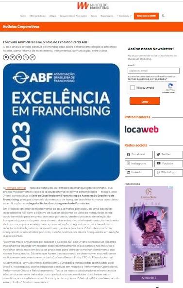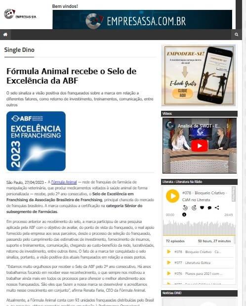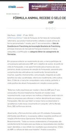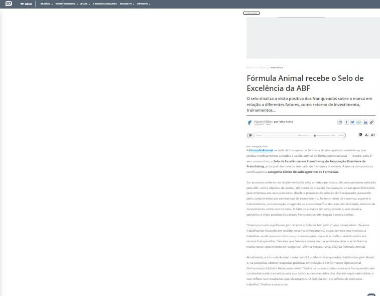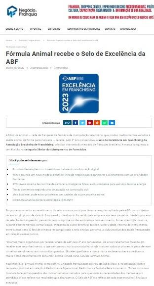 Sobre a Fórmula AnimalA Fórmula Animal é uma rede de franquias de farmácia de manipulação veterinária que produz medicamentos voltados à saúde animal de forma personalizada. Na Fórmula Animal as formulações são feitas no formato e sabor que o animal mais, gosta facilitando a vida dos tutores que escolhem como desejam oferecer a medicação ao seu animal - que pode ser em biscoitos, pastas, sachês saborizados, cápsulas, florais, torrões de açúcar, entre outras.A marca conta com mais de 80 franqueados distribuídos pelo Brasil e continua expandindo seguindo a premissa de proporcionar bem-estar aos animais e às famílias, desde 2010.Em 2022, a Fórmula Animal recebeu o Selo de Excelência em Franchising da ABF. Saiba mais em www.formulanimal.com.br