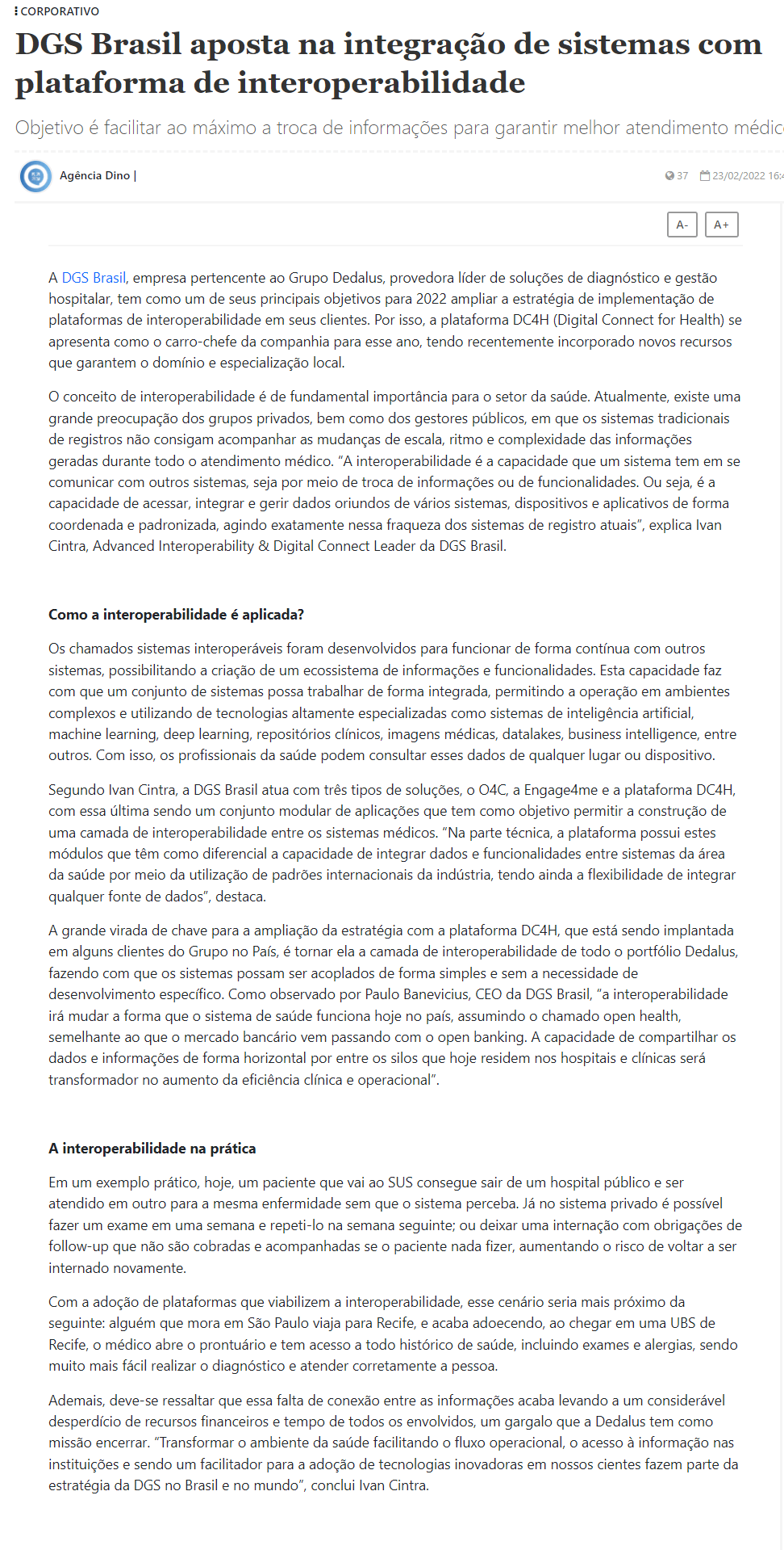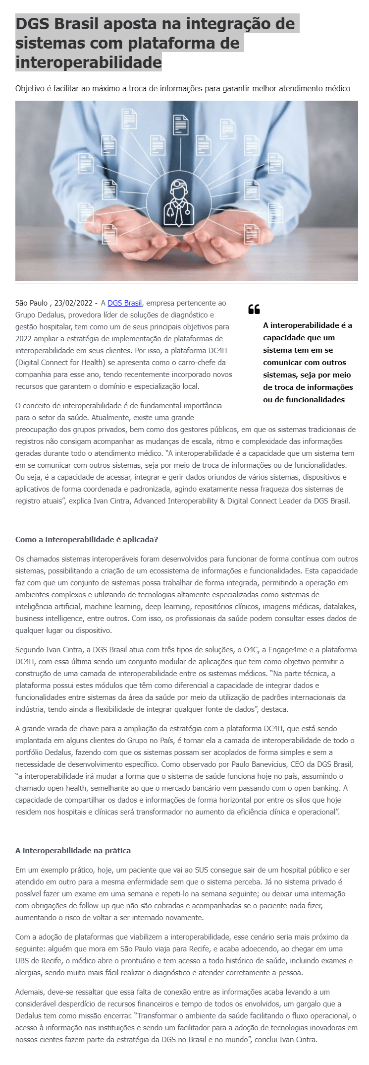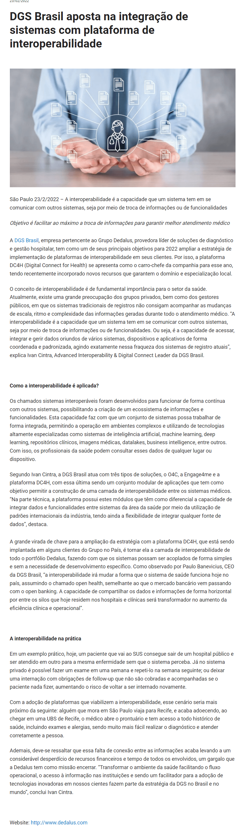 A DGS Brasil, empresa pertencente ao Grupo Dedalus, provedor líder de soluções de diagnóstico e gestão hospitalar na Europa e um dos maiores do mundo. Com sede na Itália, possui atuação mundial em mais de 30 países e cerca de 5,5 mil colaboradores, que atendem mais de 6 mil hospitais e 5,3 mil laboratórios. A empresa conta com uma área de Pesquisa e Desenvolvimento (P&D) com 1,1 mil profissionais, considerada uma das maiores da Europa. No Brasil a empresa possui escritórios em São Paulo (SP) e no Recife (PE).Em 2016 iniciou o plano de expansão com a aquisição da Agfa Healthcare IT tornando-se líder no mercado de soluções de saúde nos segmentos hospitalar e de diagnóstico. Em 2020 adquiriu a divisão de software de saúde da DXC Technology. O Grupo tem investidores como a Ardian, maior empresa de investimento privado da Europa e 4ª do mundo; e Abu Dhabi Investment Authority (ADIA).