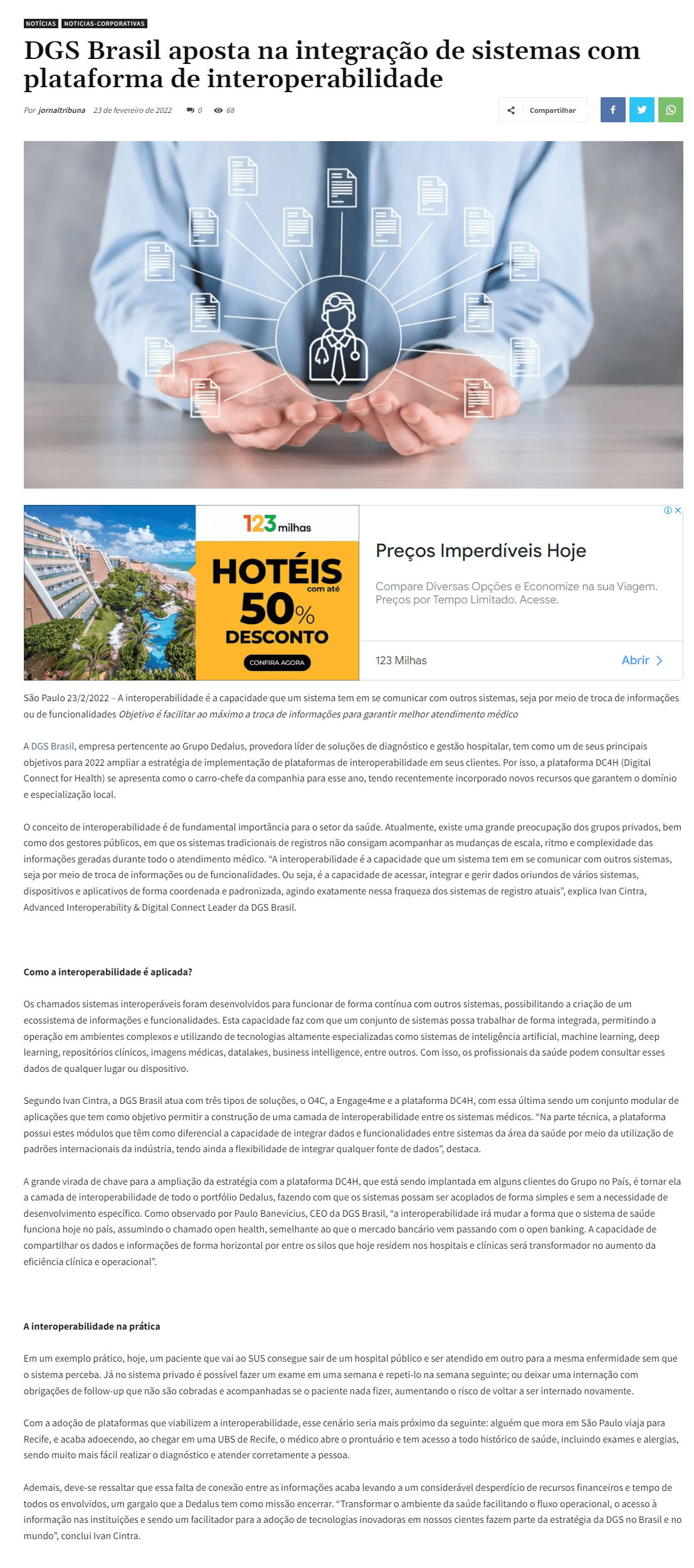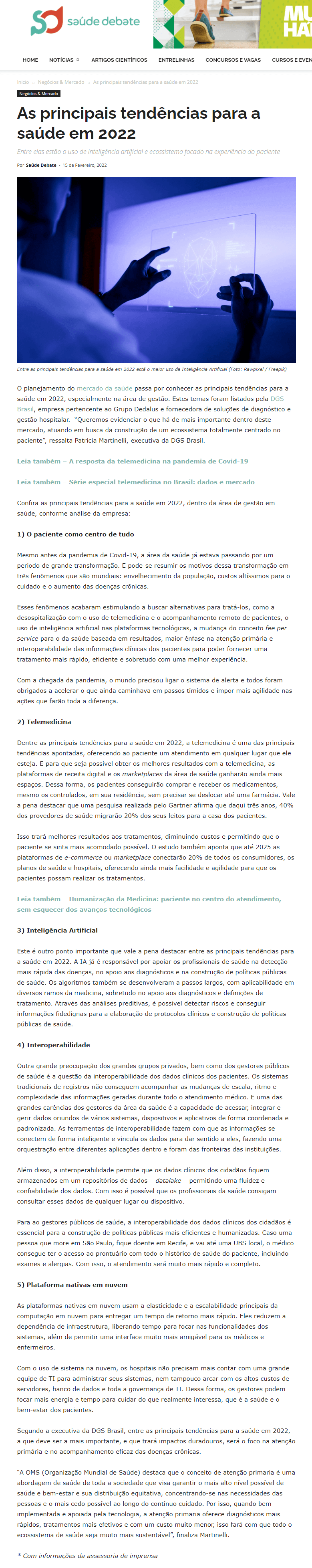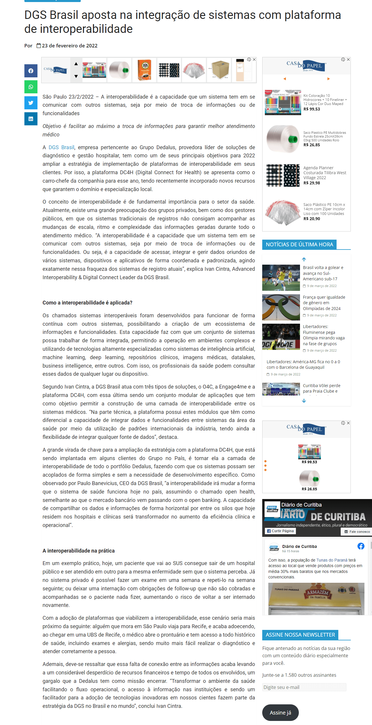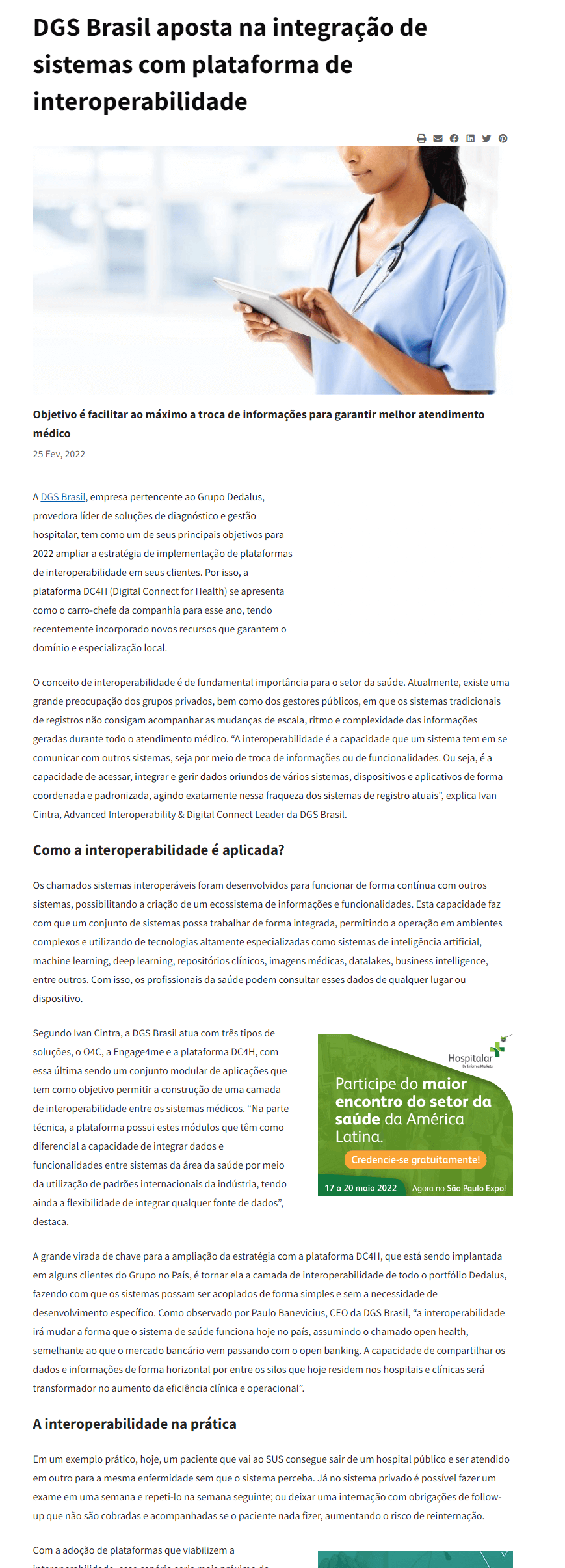 A DGS Brasil, empresa pertencente ao Grupo Dedalus, provedor líder de soluções de diagnóstico e gestão hospitalar na Europa e um dos maiores do mundo. Com sede na Itália, possui atuação mundial em mais de 30 países e cerca de 5,5 mil colaboradores, que atendem mais de 6 mil hospitais e 5,3 mil laboratórios. A empresa conta com uma área de Pesquisa e Desenvolvimento (P&D) com 1,1 mil profissionais, considerada uma das maiores da Europa. No Brasil a empresa possui escritórios em São Paulo (SP) e no Recife (PE).Em 2016 iniciou o plano de expansão com a aquisição da Agfa Healthcare IT tornando-se líder no mercado de soluções de saúde nos segmentos hospitalar e de diagnóstico. Em 2020 adquiriu a divisão de software de saúde da DXC Technology. O Grupo tem investidores como a Ardian, maior empresa de investimento privado da Europa e 4ª do mundo; e Abu Dhabi Investment Authority (ADIA).