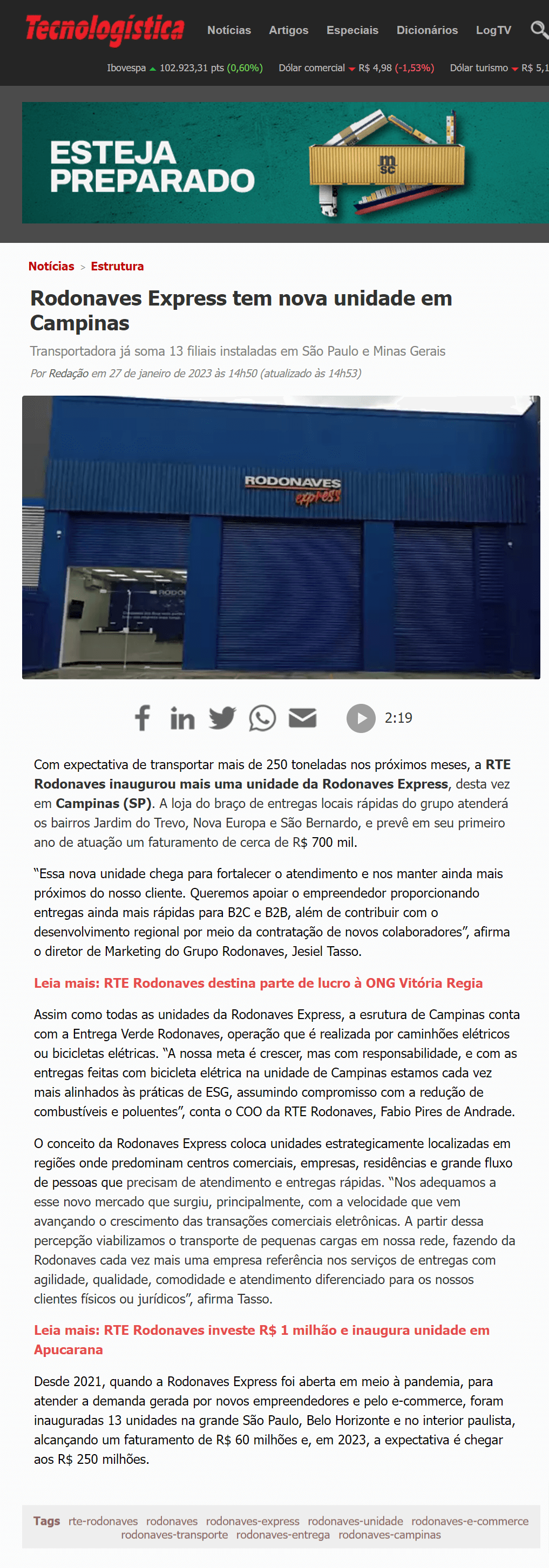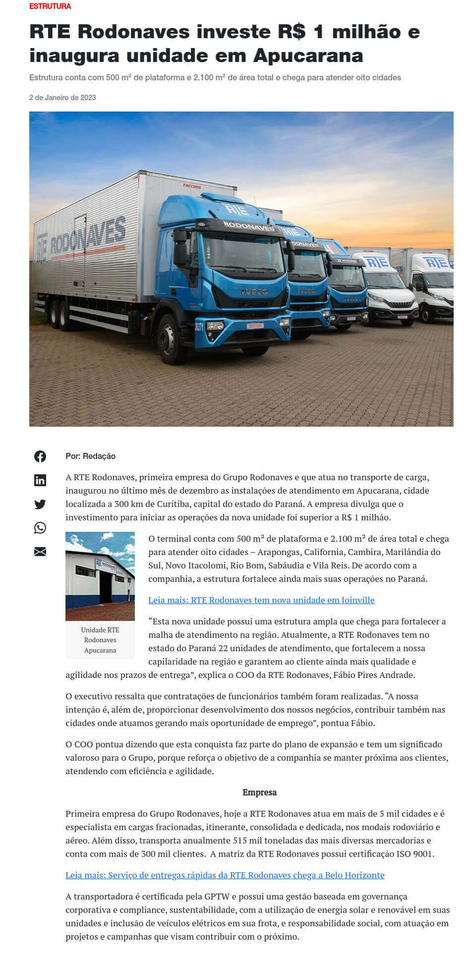 Primeira empresa do Grupo Rodonaves e uma das principais e maiores empresas de transporte do Brasil. Com atuação em mais de 5.000 cidades, a empresa é especialista em cargas fracionadas, itinerante, consolidada e dedicada, nos modais rodoviário e aéreo. Com uma história de 40 anos, transporta anualmente 515 mil toneladas das mais diversas mercadorias. A transportadora é certificada pela FIA e pela GPTW por suas boas práticas relacionadas ao clima organizacional e pela construção de equipes mais unidas, de uma atmosfera de trabalho mais harmoniosa e de uma organização mais produtiva. Referência em gestão para todas as unidades da empresa, a matriz da RTE Rodonaves possui certificação ISO 9001, por sua administração moderna e eficiente. Mais informações sobre a RTE Rodonaves acesse: http://www.rte.com.br/.