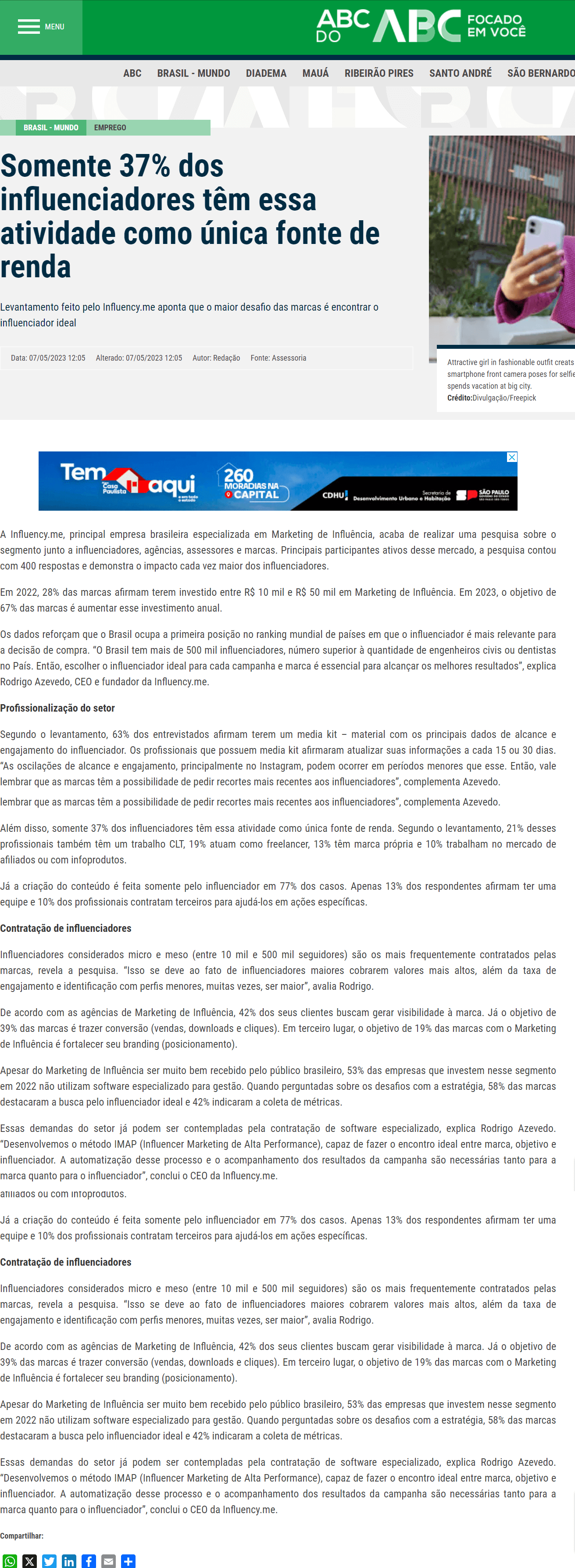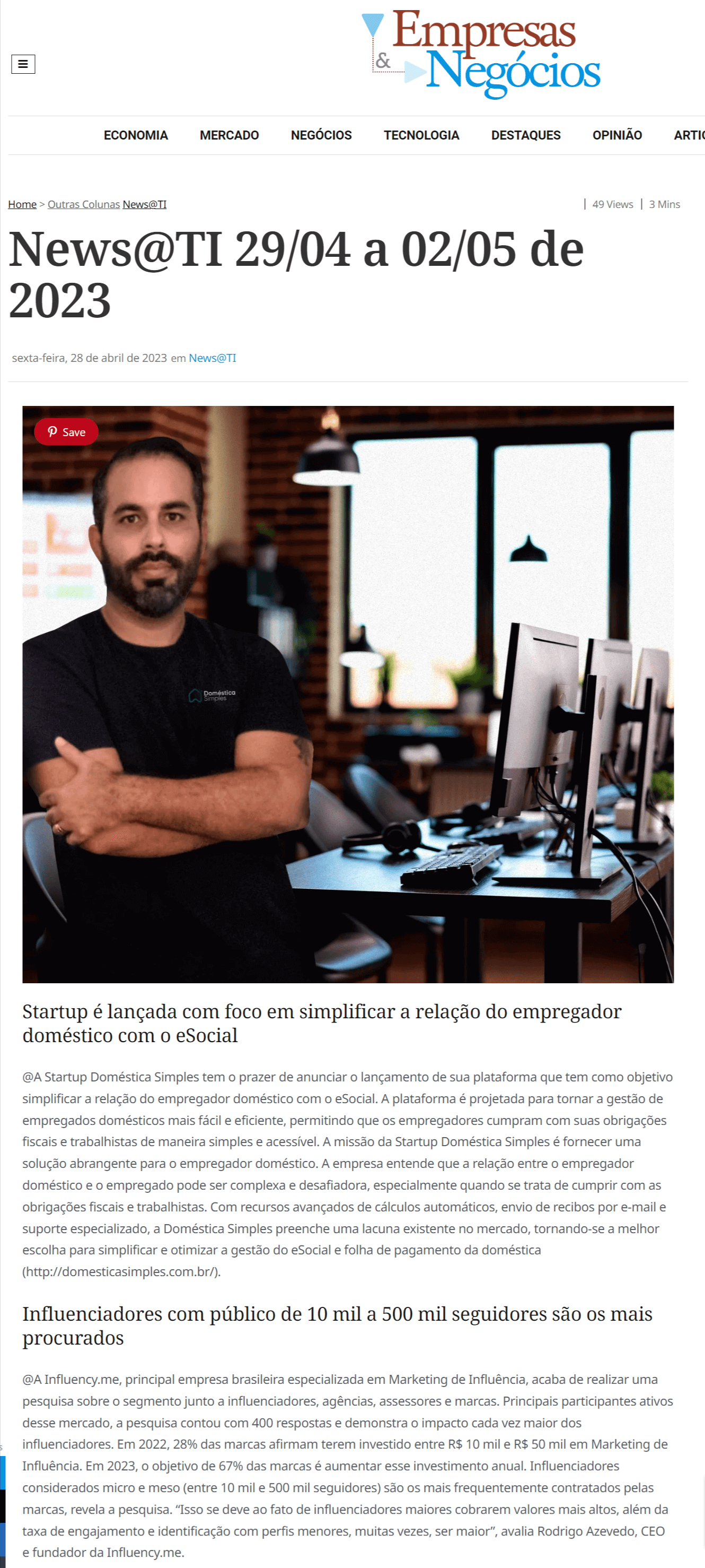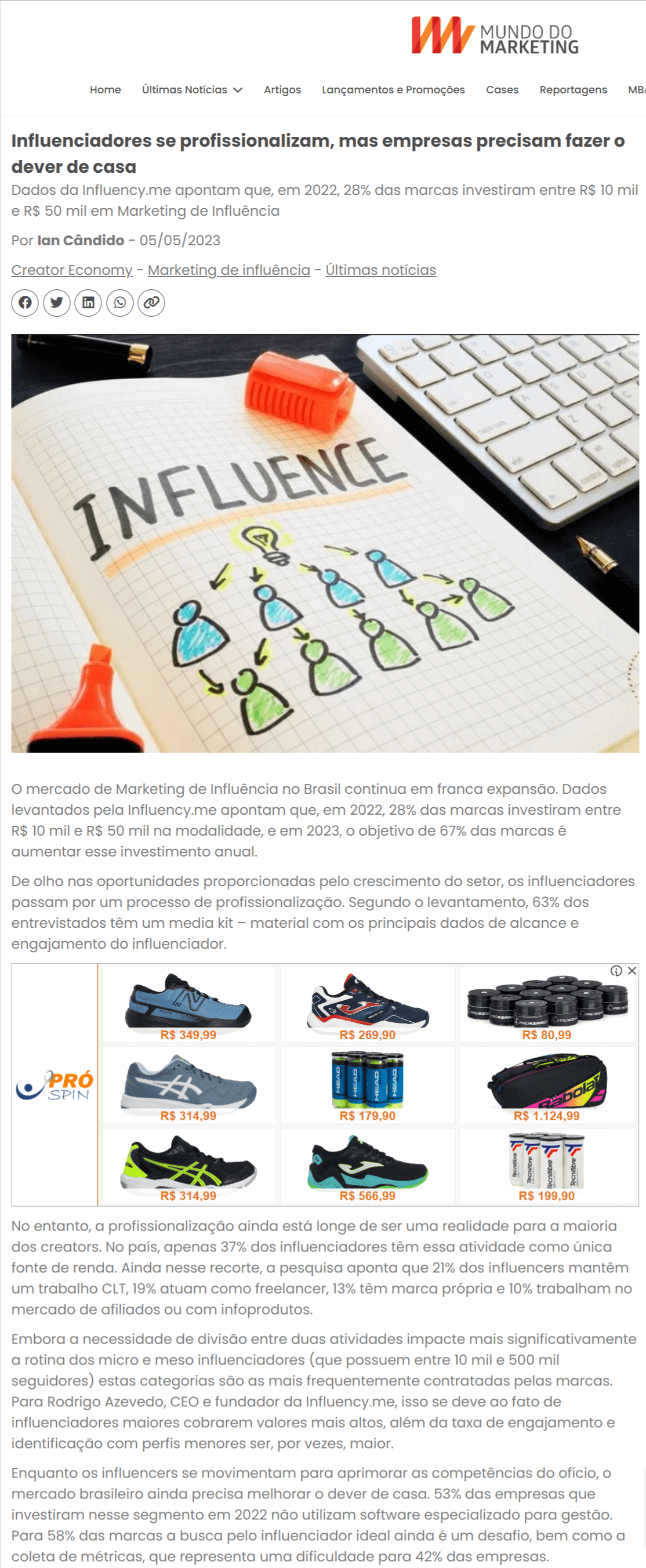 Lançada em 2018, a Influency.me é a principal empresa brasileira especializada em Marketing de Influência. Por meio de metodologia própria denominada IMAP - Influencer Marketing de Alta Performance, proporciona soluções completas para quem quer trabalhar com influenciadores digitais.Reúne dados de mais de 1 milhão de perfis de influenciadores digitais. Utiliza o search engine, mecanismo que torna mais rápido e assertivo o processo de encontrar o influenciador certo para cada ação, assim como workflow de campanhas, monitoramento e geração de relatórios. Além disso, oferece a opção full service em que uma equipe com expertise cuida de toda a estratégia.Nos últimos quatro anos, a companhia cresceu cerca de 210%, finalizando 2023 com faturamento de mais de R$ 9,2 milhões. Com o propósito de criar conexões reais entre marcas e pessoas, disponibiliza gratuitamente cursos na Academia Influency.me e conteúdos ricos a fim de estimular o desenvolvimento da influência digital no país.