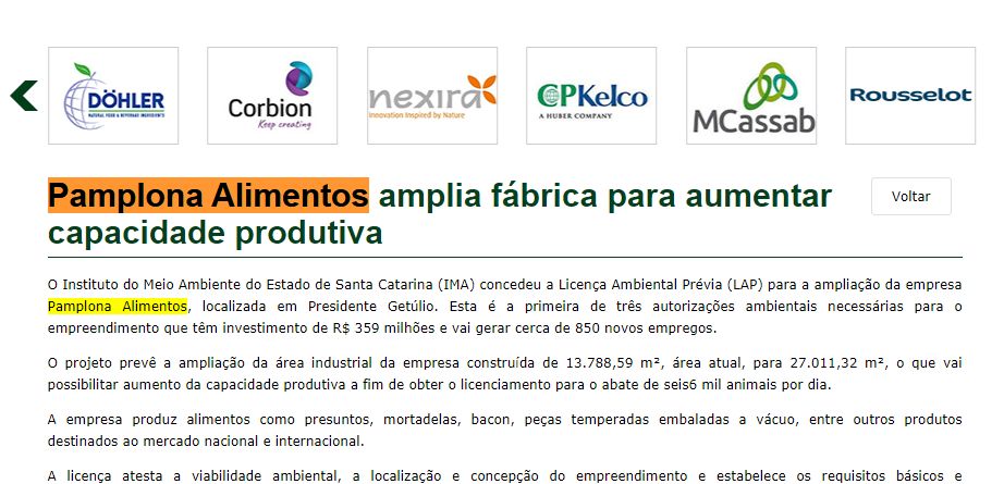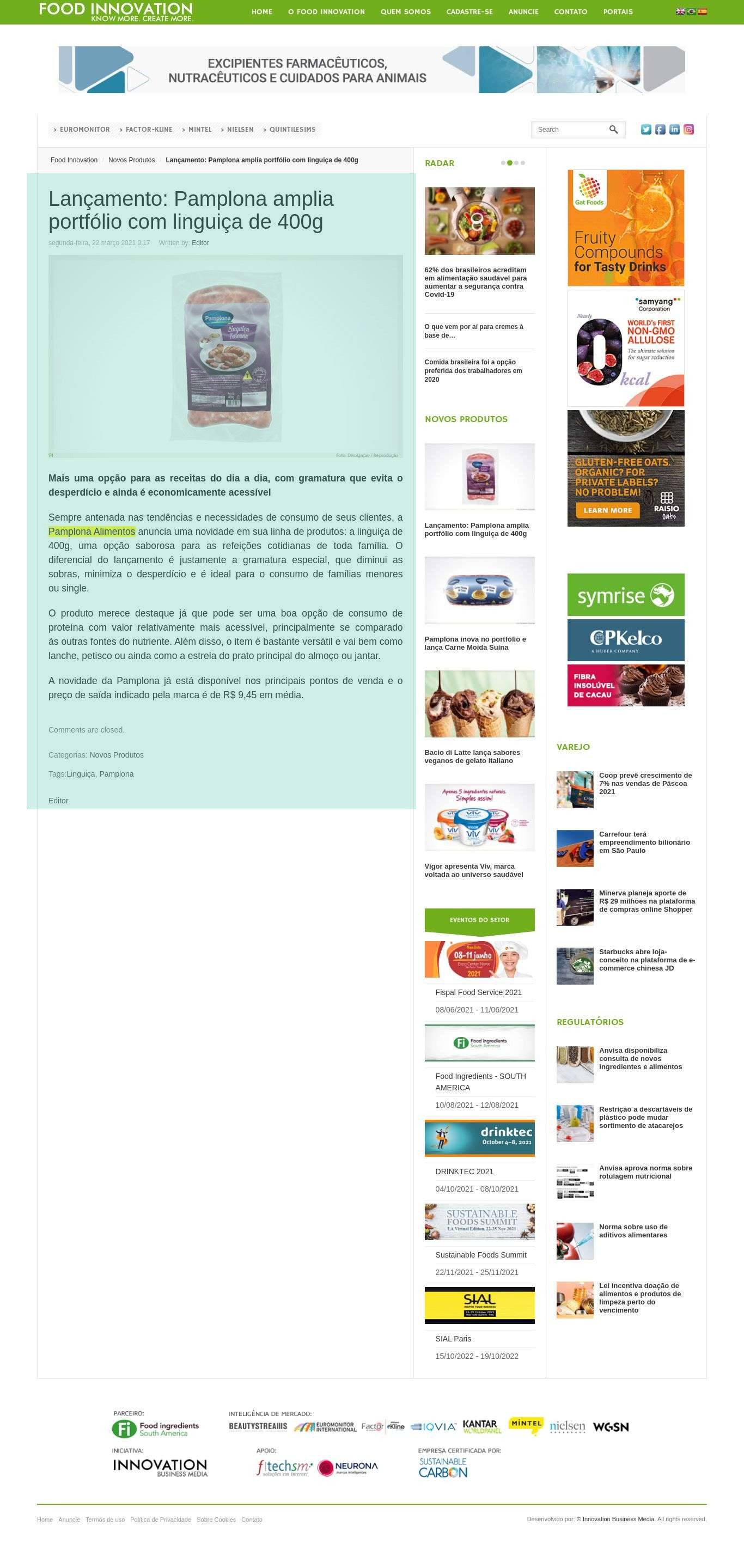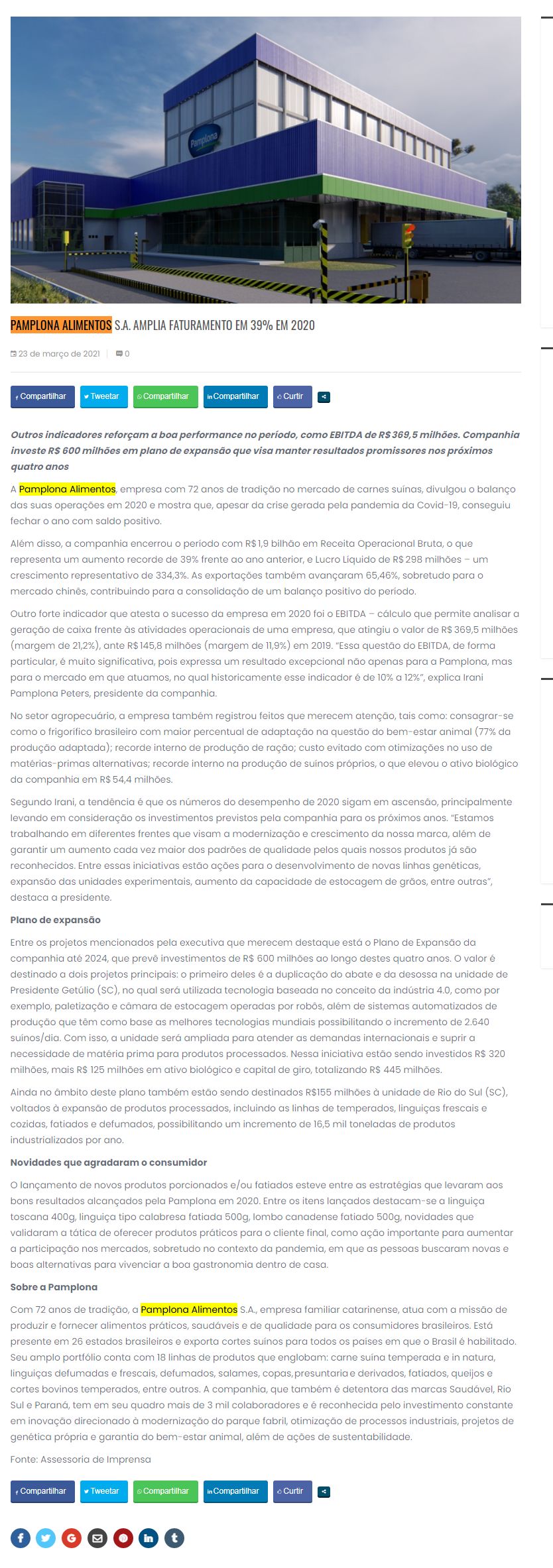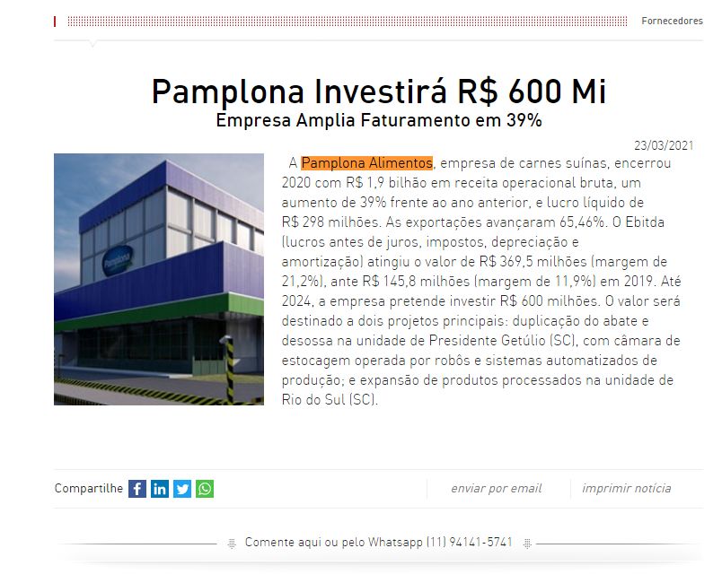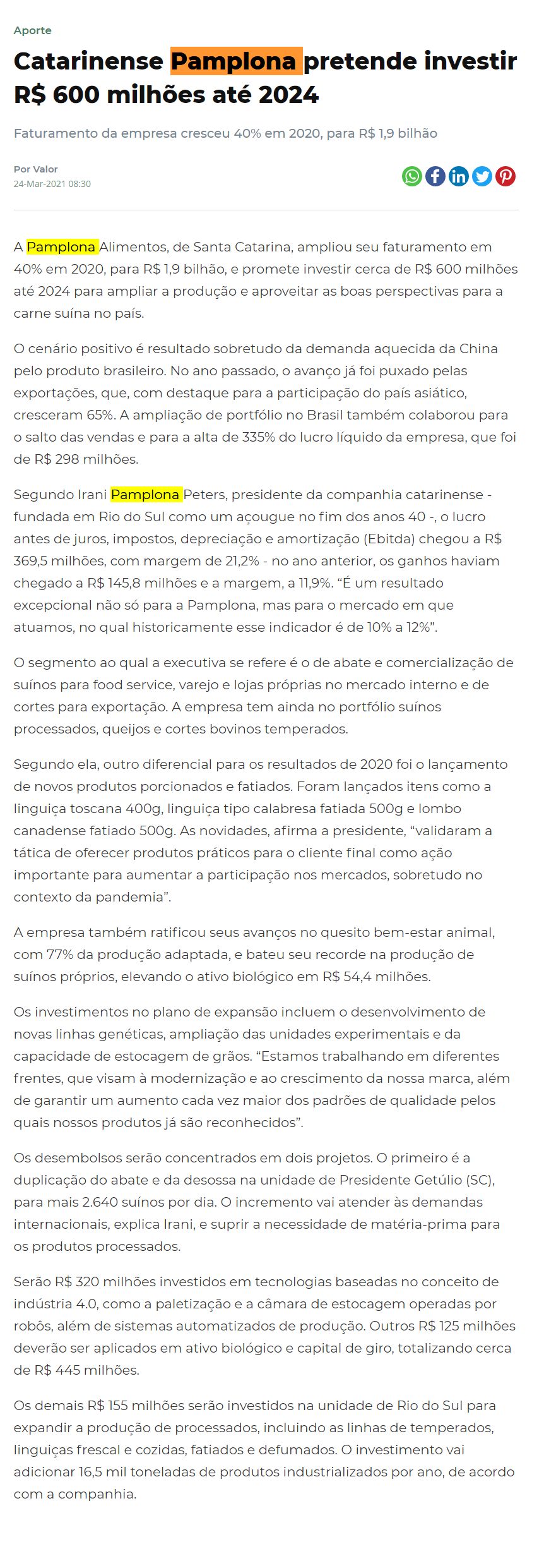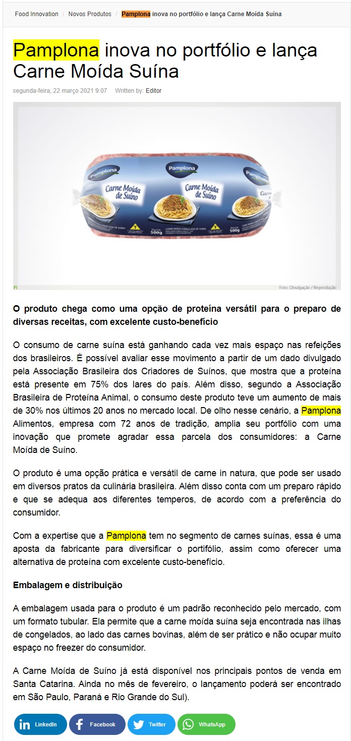 Com 77 anos de tradição, a Pamplona Alimentos S.A., empresa familiar catarinense, atua com a missão de produzir e fornecer alimentos práticos, saborosos, saudáveis e de qualidade para os consumidores brasileiros. Está presente em 26 estados brasileiros e exporta cortes suínos para os principais países em que o Brasil é habilitado. Seu amplo portfólio conta com 14 linhas de produtos que englobam: carne suína temperada e in natura, linguiças defumadas e frescais, defumados, salames, copas, presuntaria e derivados, fatiados, queijos, entre outros. A companhia, que também é detentora das marcas Paraná, Rio Sul e Saudável, tem em seu quadro mais de 3.7 mil colaboradores e é reconhecida pelo investimento constante em inovação direcionado à modernização do parque fabril, otimização de processos industriais e manutenção dos padrões de qualidade de seus produtos.