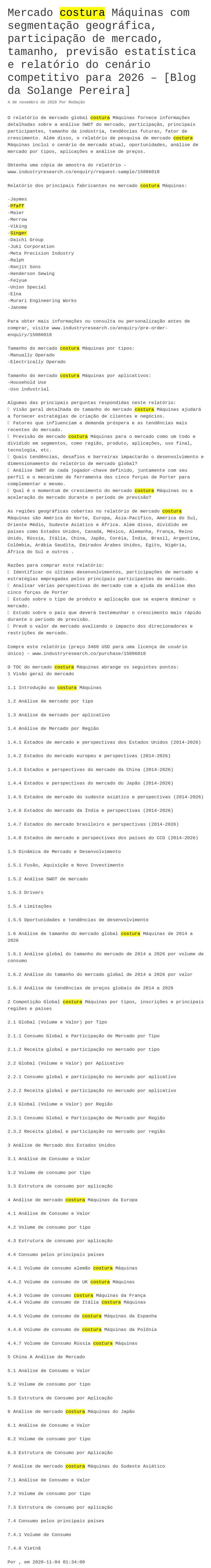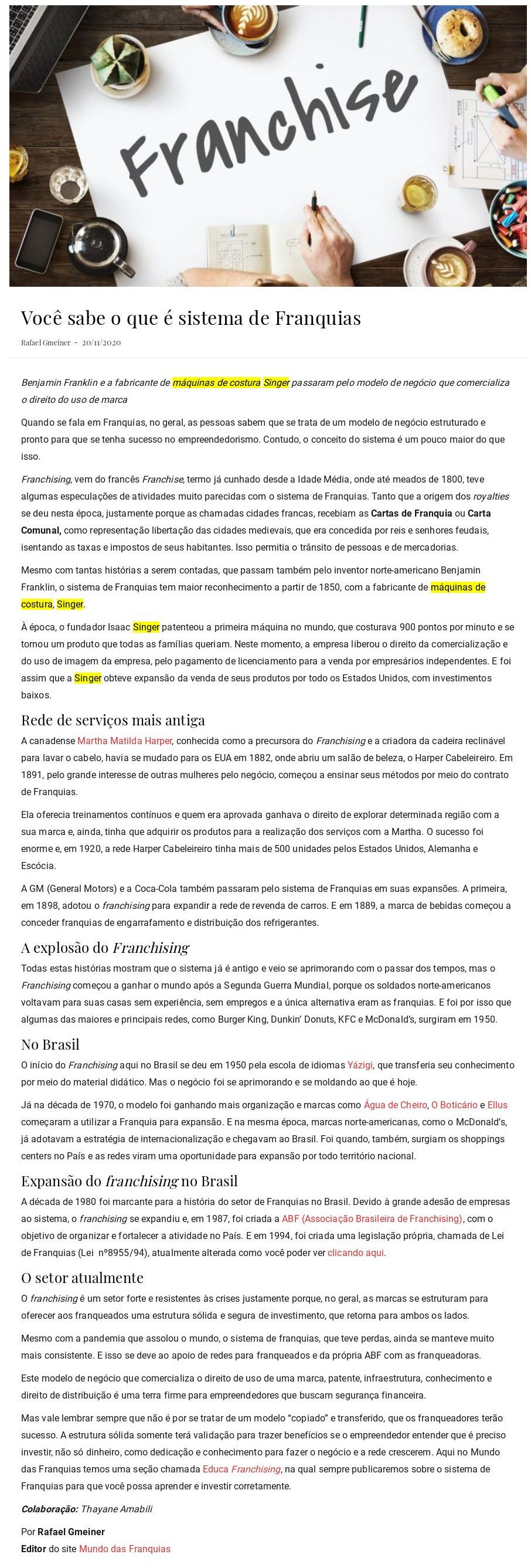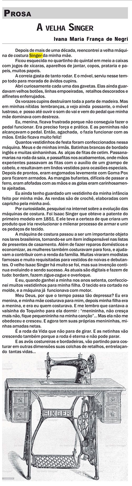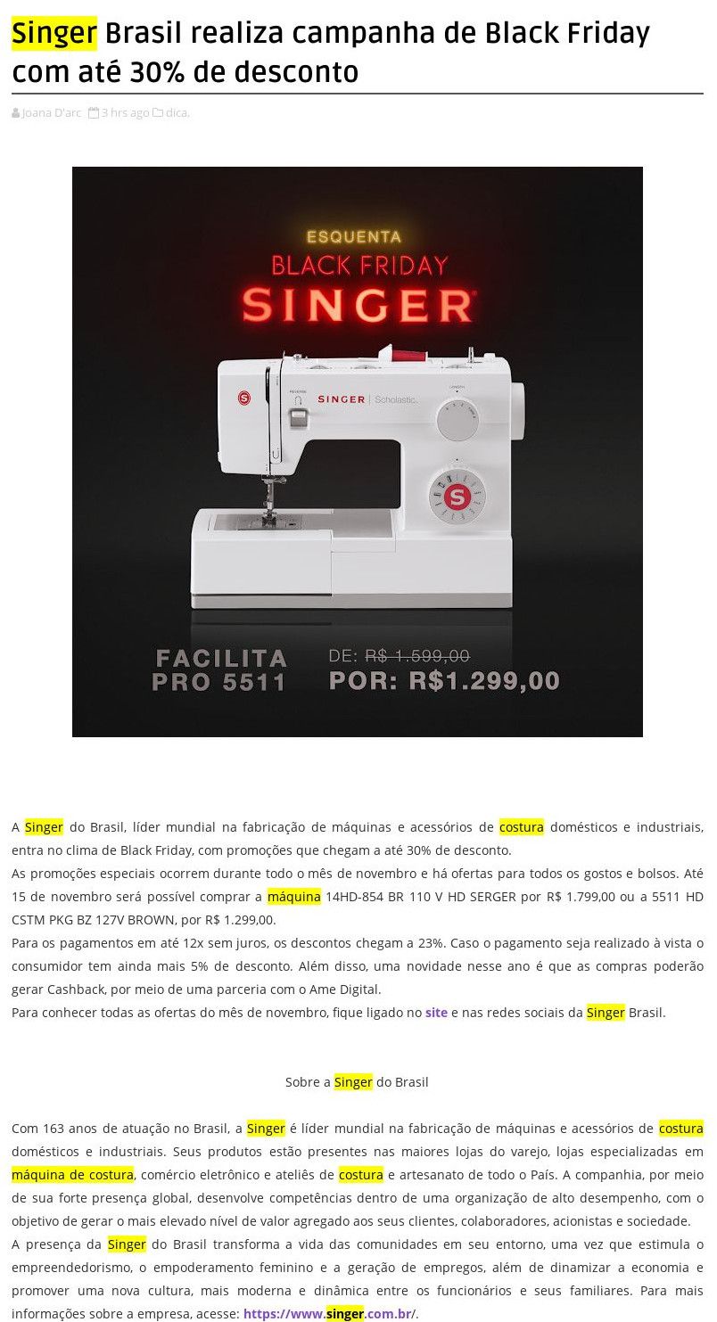 Com 170 anos de atuação, a Singer é líder mundial na fabricação de máquinas e acessórios de costura domésticos e industriais. Seus produtos estão presentes nas maiores lojas do varejo, lojas especializadas em máquina de costura, comércio eletrônico e ateliês de costura e artesanato de todo o País. A companhia, por meio de sua forte presença global, desenvolve competências dentro de uma organização de alto desempenho, com o objetivo de gerar o mais elevado nível de valor agregado aos seus clientes, colaboradores, acionistas e sociedade. A presença da Singer do Brasil transforma a vida das comunidades em seu entorno, uma vez que estimula o empreendedorismo, o empoderamento feminino e a geração de empregos, além de dinamizar a economia e promover uma nova cultura, mais moderna e dinâmica entre os funcionários e seus familiares. Para mais informações sobre a empresa, acesse: https://www.singer.com.br.