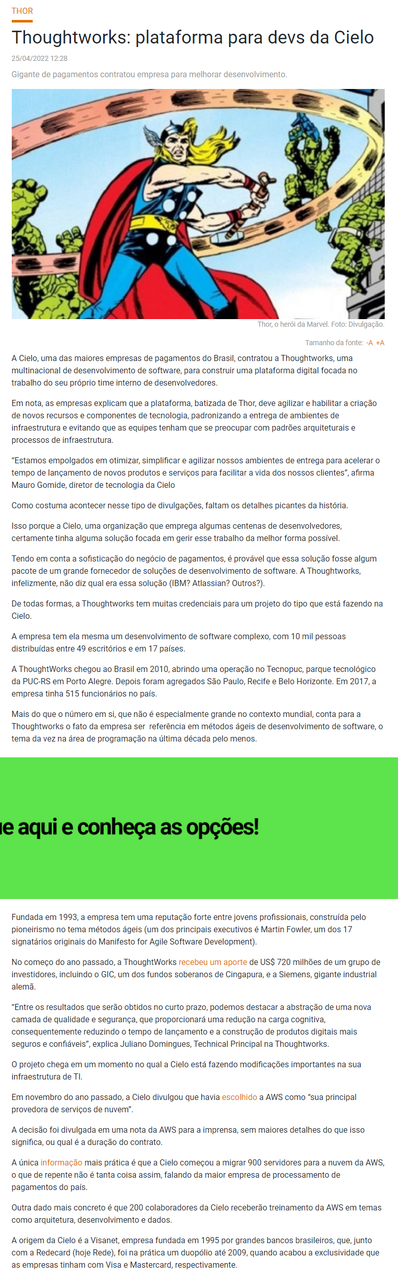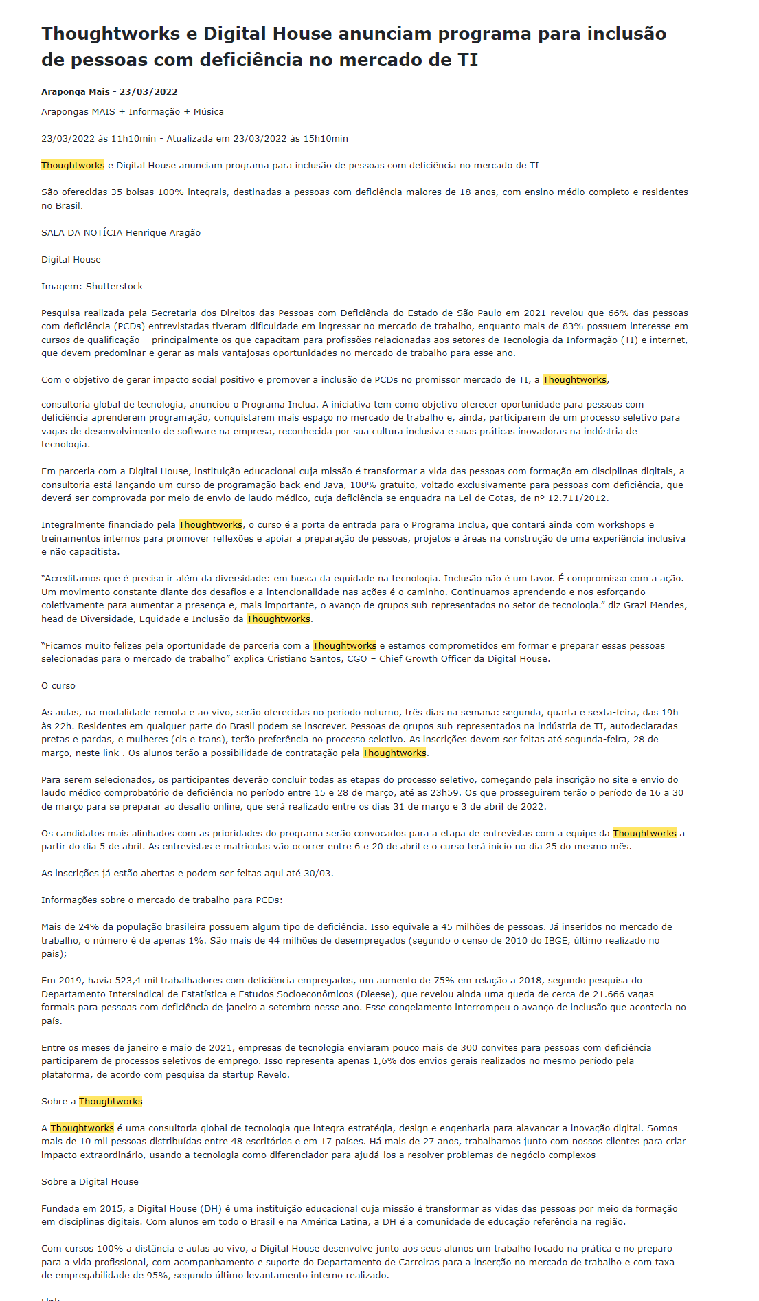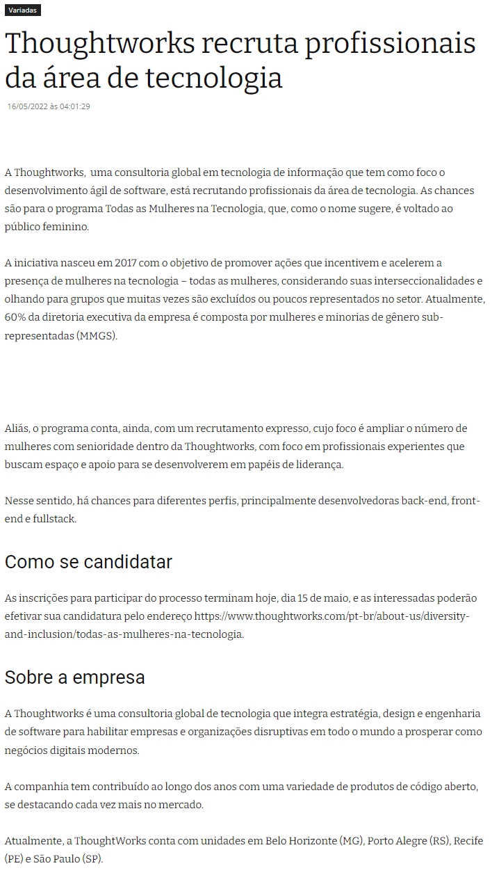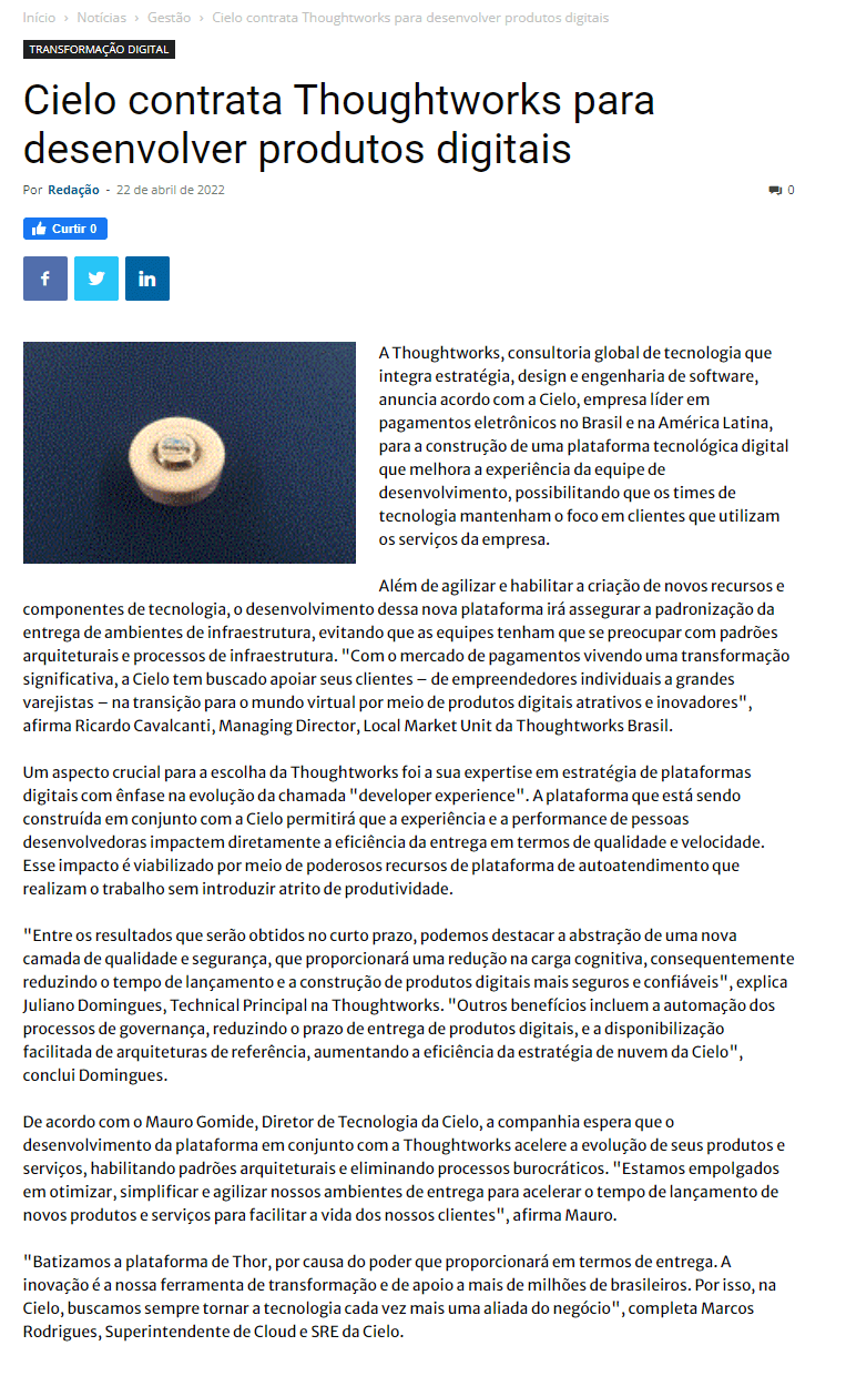 Esta é a sala de imprensa da Thoughtworks. Aqui você encontra press releases, novidades e os principais resultados em veículos de comunicação e canais de influenciadores conquistados pela equipe de Assessoria de Imprensa do Grupo Trama Reputale.