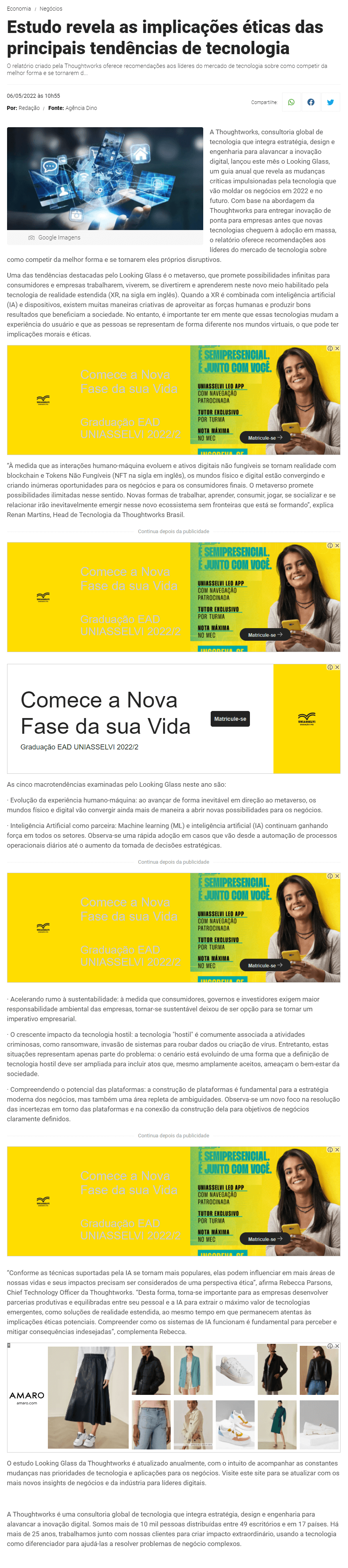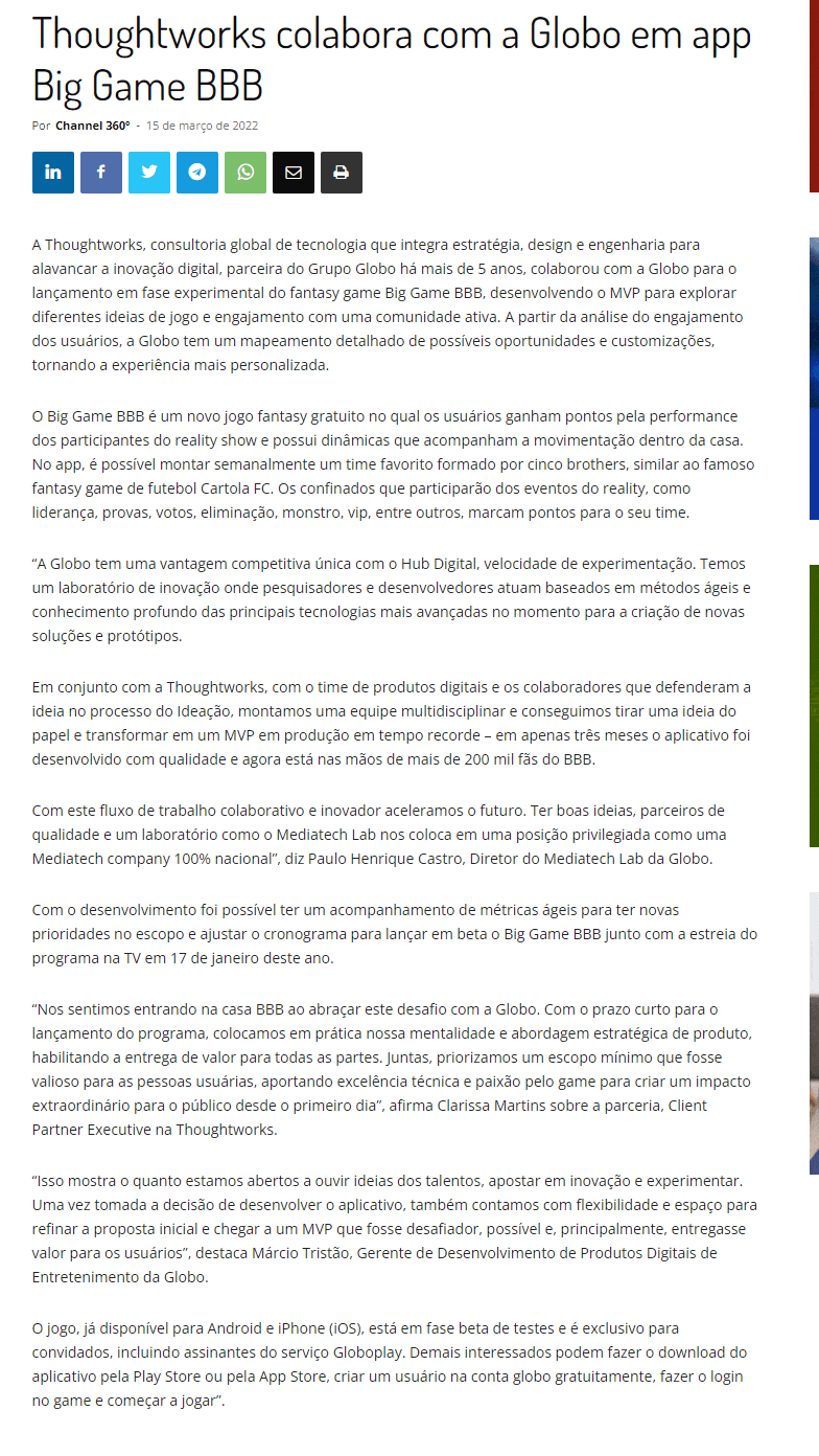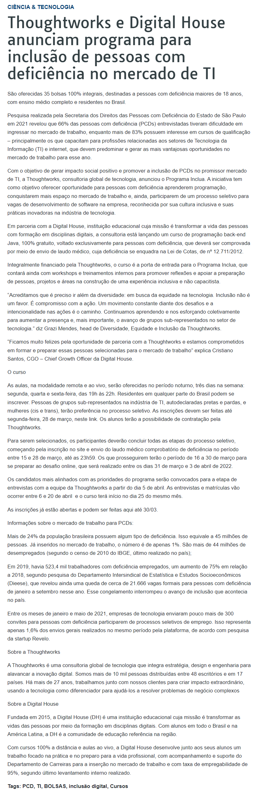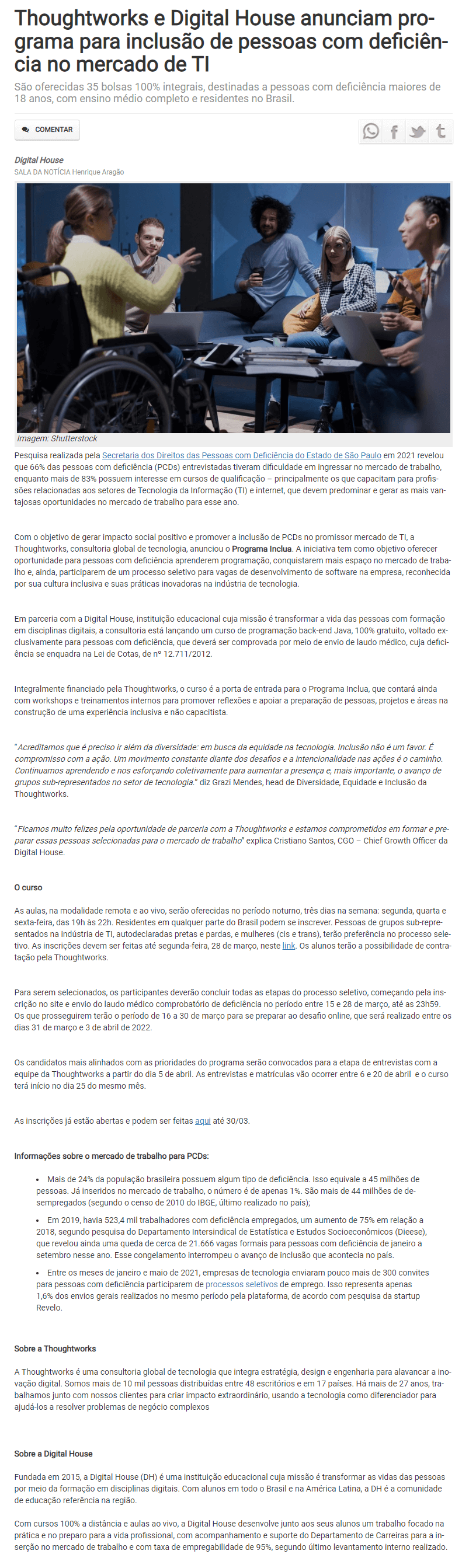 Esta é a sala de imprensa da Thoughtworks. Aqui você encontra press releases, novidades e os principais resultados em veículos de comunicação e canais de influenciadores conquistados pela equipe de Assessoria de Imprensa do Grupo Trama Reputale.