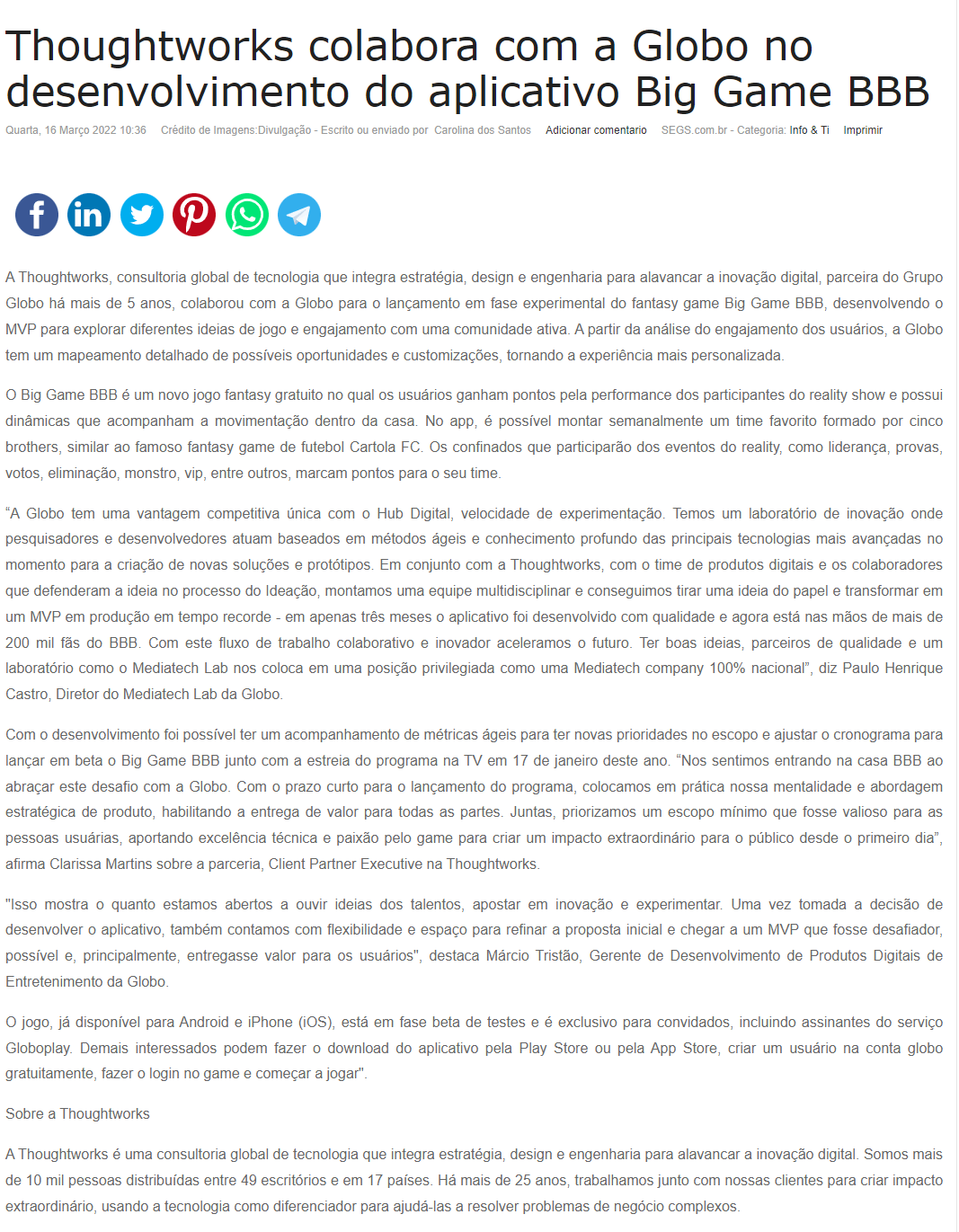 Esta é a sala de imprensa da Thoughtworks. Aqui você encontra press releases, novidades e os principais resultados em veículos de comunicação e canais de influenciadores conquistados pela equipe de Assessoria de Imprensa do Grupo Trama Reputale.